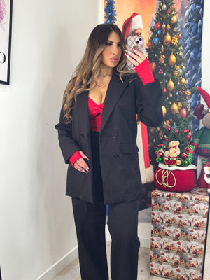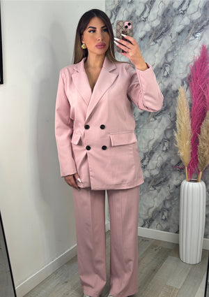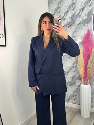 Tailleur classico composto da giacca con spalline imbottita e quattro bottoni, pantalone strutturato con passanti tasche ed elastico sul retro che ci permette di vestire bene da una taglia S fino ad una taglia L, pur essendo taglia unica.